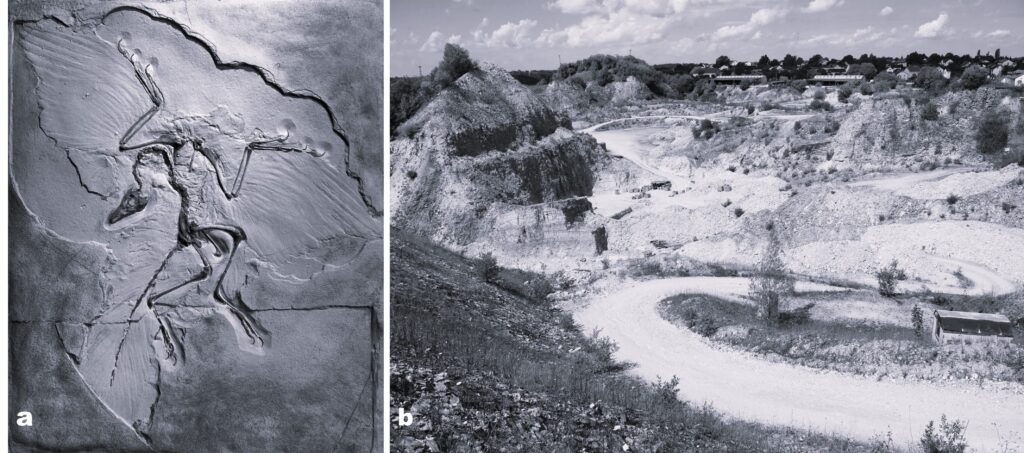 (a) Photo of a fossil of Archaeopteryx, the bird-like dinosaur (that lived around 150 million years ago), discovered from (b) a stone quarry in Solnhofen, Bavaria (Germany) (Caption and image credit: Vanishing Life on Earth)