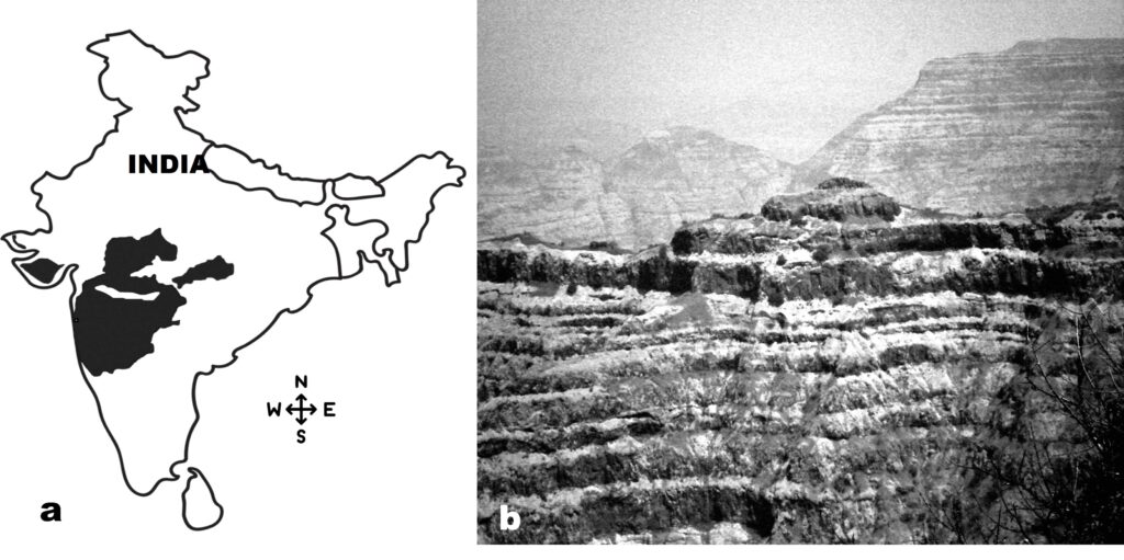 (a) Schematic map of India showing the area of ‘Deccan traps’ in the Western Ghat region near Mahabaleshwar (b) View of ‘Deccan traps’ showing stacks of historical lava flow (horizontal layers of rocks) (Caption and image credit: Vanishing Life on Earth)