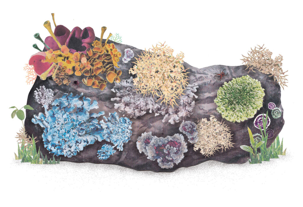 There are about 30,000 species of lichen-fungi globally, contributing to the Earth’s extraordinary biodiversity. They operate in symbiosis as primary producers, providing food for animals that scale from mites to caribou. They create habitat structures for invertebrates, which in turn support bird populations. They sequester and process atmospheric water and nutrients, and the lichens with cyanobacteria can ‘fix’ nitrogen directly from the atmosphere, rather like the nodules of legume roots.