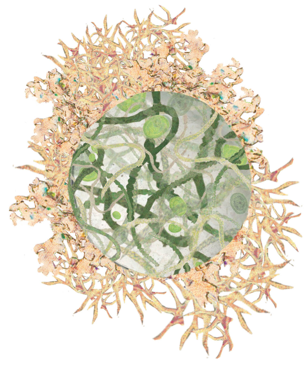 Lichens are sometimes referred to as ‘mini-ecosystems’. This is because they are not one thing but composed of at least two functionally different partners that coexist in regulatory balance. One partner—an alga or a cyanobacteria—is a primary producer, using photosynthesis to create sugars for food. The other partner—a fungus—is a consumer, harvesting some of this food production to meet its own energy requirements. The consumer fungus creates the structure of the lichen (the ‘thallus’), within which it protects the primary producer from harm, be that herbivores or excess light. Lichens are therefore created by fungi that have evolved this specialist mode of nutrition, and different lichens represent different fungal species.