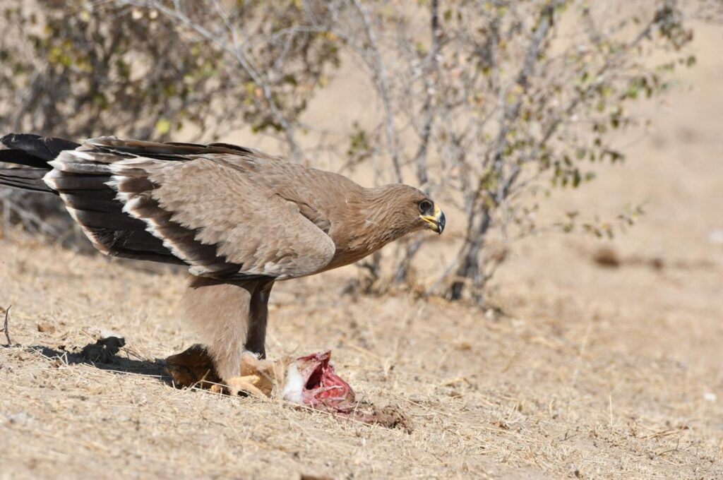 Thousands of vultures cover the ground and sky. Some are perched on trees, not 10 feet away from you, while some circle in the thermals above or sit feeding on piles of flesh and bones. Everywhere you look, there are species that are rarely spotted elsewhere in the country. Some of the species I have observed on site include the Eurasian and Himalayan griffons, Egyptian and cinereous vultures, steppe, tawny, imperial, and white-tailed eagles, and black kites. I was also lucky enough to see the rare yellow-eyed pigeon!