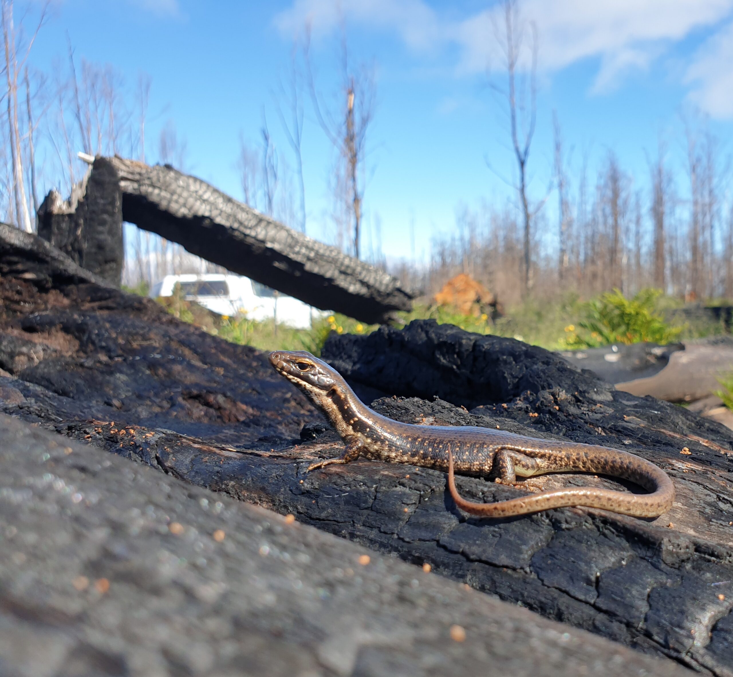 Feature image: A southern water skink (Eulamprus tympanum) basking on a charred log after the 2019–20 Australian megafires (Photo credit: Kristina Macdonald)